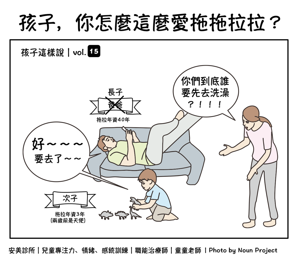 像此篇要討論的拖拖拉拉,就是「我們覺得孩子在錯誤的時間點,做著錯誤的事情,還不會聽我們的話停下來。」