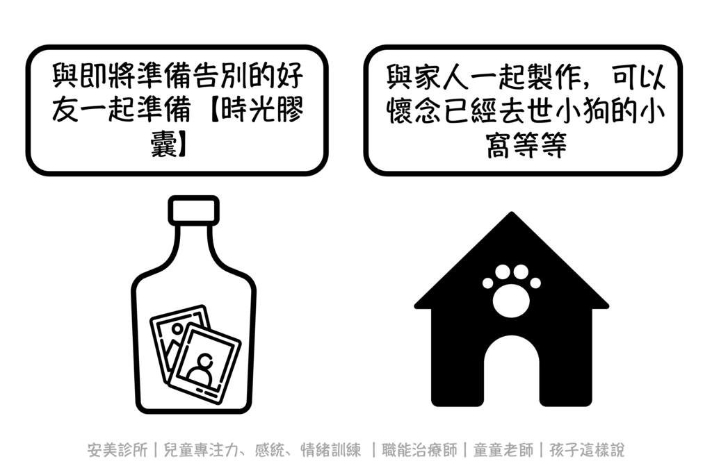 儀式行為的選擇則可與孩子一起討論。與即將準備告別的好友一起準備時光膠囊、與家人一起製作,可以懷念已經去世小狗的小窩等等,就是儀式行為的例子。